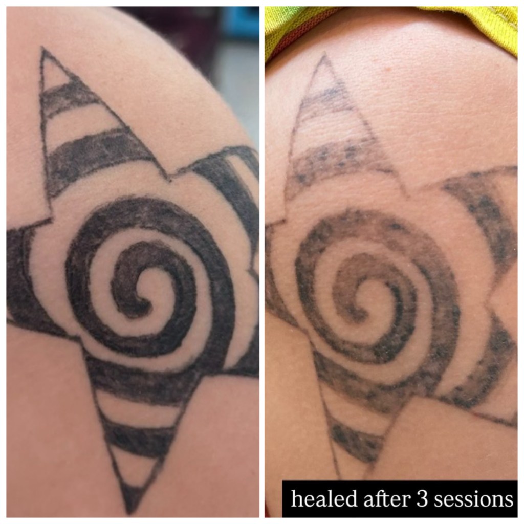 If you’re looking to lighten your tattoo for a cover-up, 2–4 sessions is typically ideal. If your goal is full removal, the process can take 8–12 sessions.